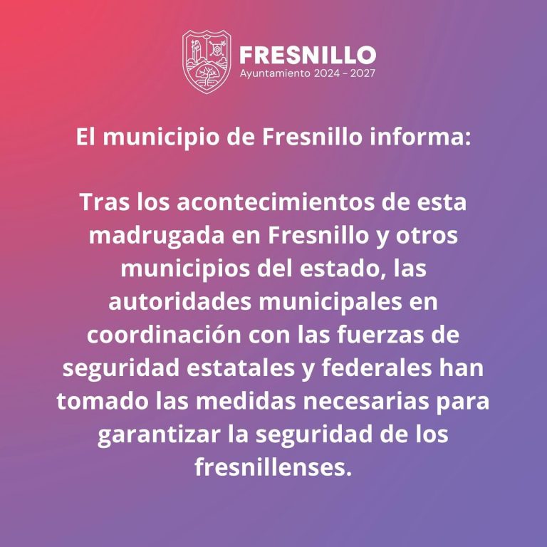 Tras los acontecimientos registrados esta madrugada en Fresnillo y otros municipios del estado, el Gobierno Municipal, en coordinación con las