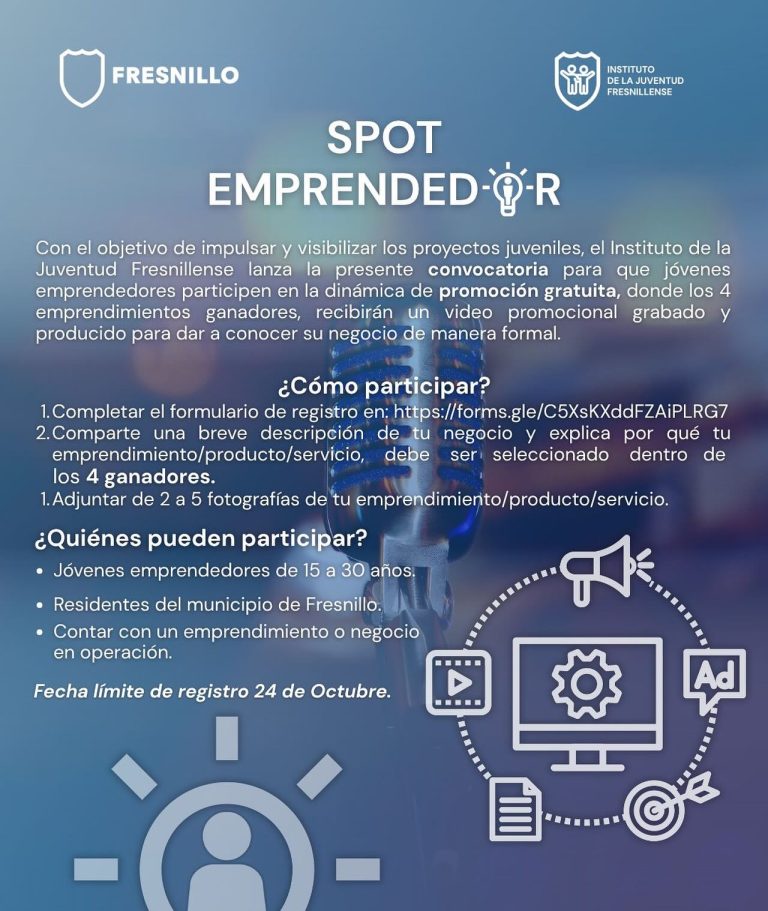 El Instituto de la Juventud Fresnillense invita a jóvenes emprendedores a participar en SPOT EMPRENDEDOR, una iniciativa diseñada para visibilizar